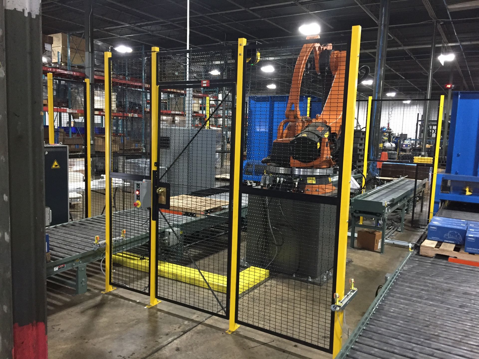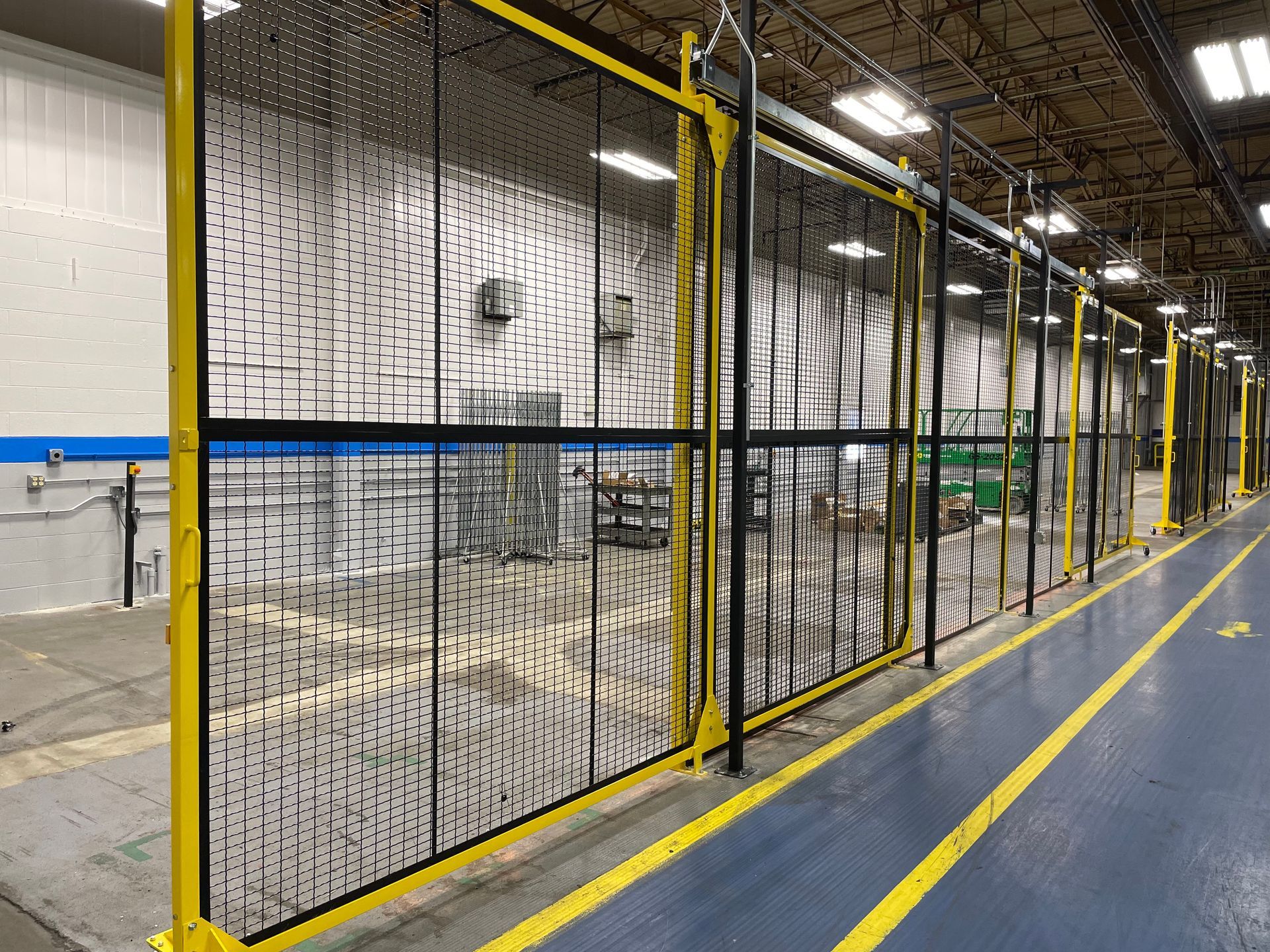 Our wire partitions—or steel panels—can be stacked between tube posts. This provides a safe place that enables the enclosure vertically to the standard of 10 feet in height. The structural stability of the enclosure is solid and sound. All panels are bolted which promotes extra efficiency, easy installation, and stability of the enclosure. We can also customize your wire enclosures based on the height and width of the area you need enclosed, allowing for electronic access to the enclosure, posts with extended height, variable sweep space, and custom-sized panels that allow for stairways, windows, and more.